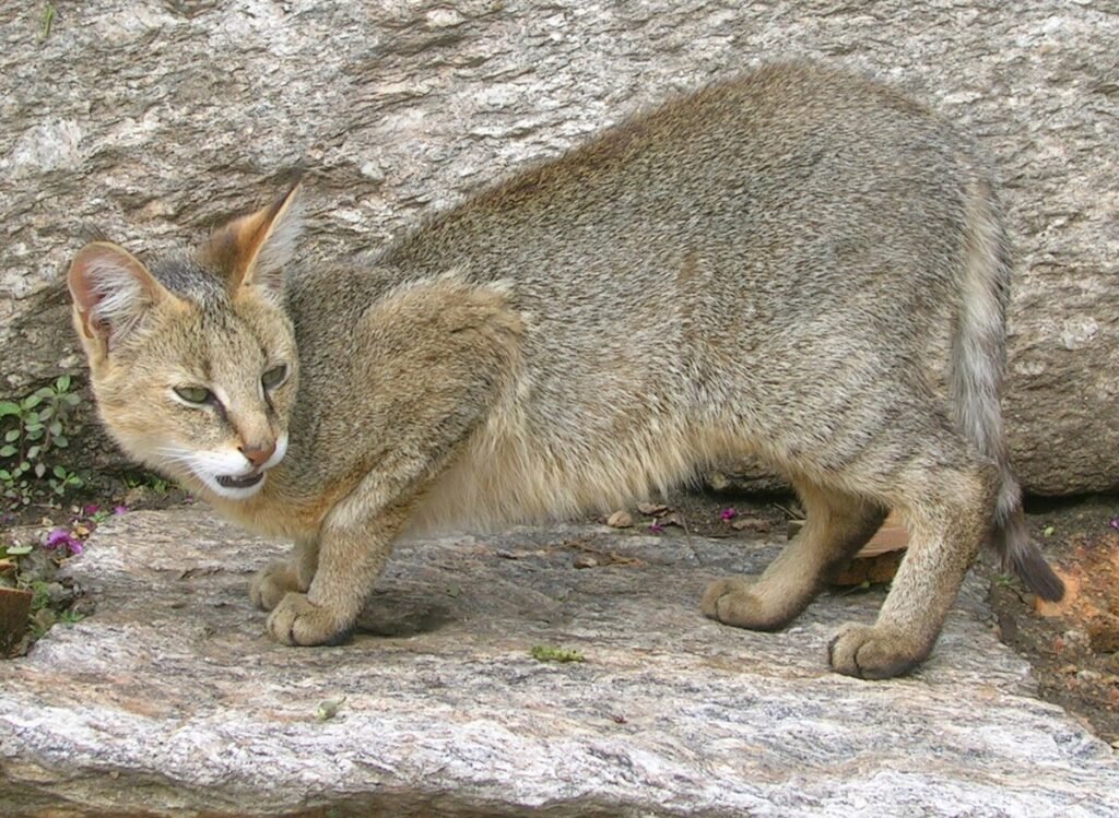 The jungle cat, Felis chaus, is a medium-sized wild cat widely distributed across Asia, from the Middle East to Southeast Asia, and parts of North Africa. Unlike its name suggests, it is not restricted to dense jungles but thrives in a variety of habitats, including grasslands, savannas, agricultural areas, and especially wetlands, reed beds, and riverine forests. It possesses a relatively uniform sandy-brown to reddish-brown or grayish coat, typically unspotted, with faint stripes on its legs and tail. Its long legs, relatively short tail, and distinctively large, pointed ears are characteristic features. Primarily diurnal or crepuscular, the jungle cat is an agile and opportunistic hunter, preying on a wide range of animals including rodents, birds, frogs, snakes, and even sh, showcasing its adaptability and keen hunting skills.