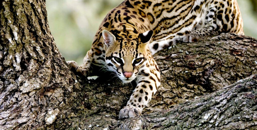 The ocelot, Leopardus pardalis, is a striking medium-sized wild cat found in the dense forests, scrublands, and coastal marshes of the southwestern United States, Mexico, Central, and South America. Renowned for its stunning coat, which features distinctive black rosettes and stripes on a tawny or yellowish background, the ocelot’s patterns are unique to each individual. This largely nocturnal and solitary hunter is a skilled climber and swimmer, spending its days resting in trees or dense vegetation and its nights hunting. Its diverse diet includes small mammals like rodents and opossums, birds, reptiles, and amphibians. Despite its relatively small size, the ocelot is a powerful and efficient predator, adapted to a wide range of habitats.