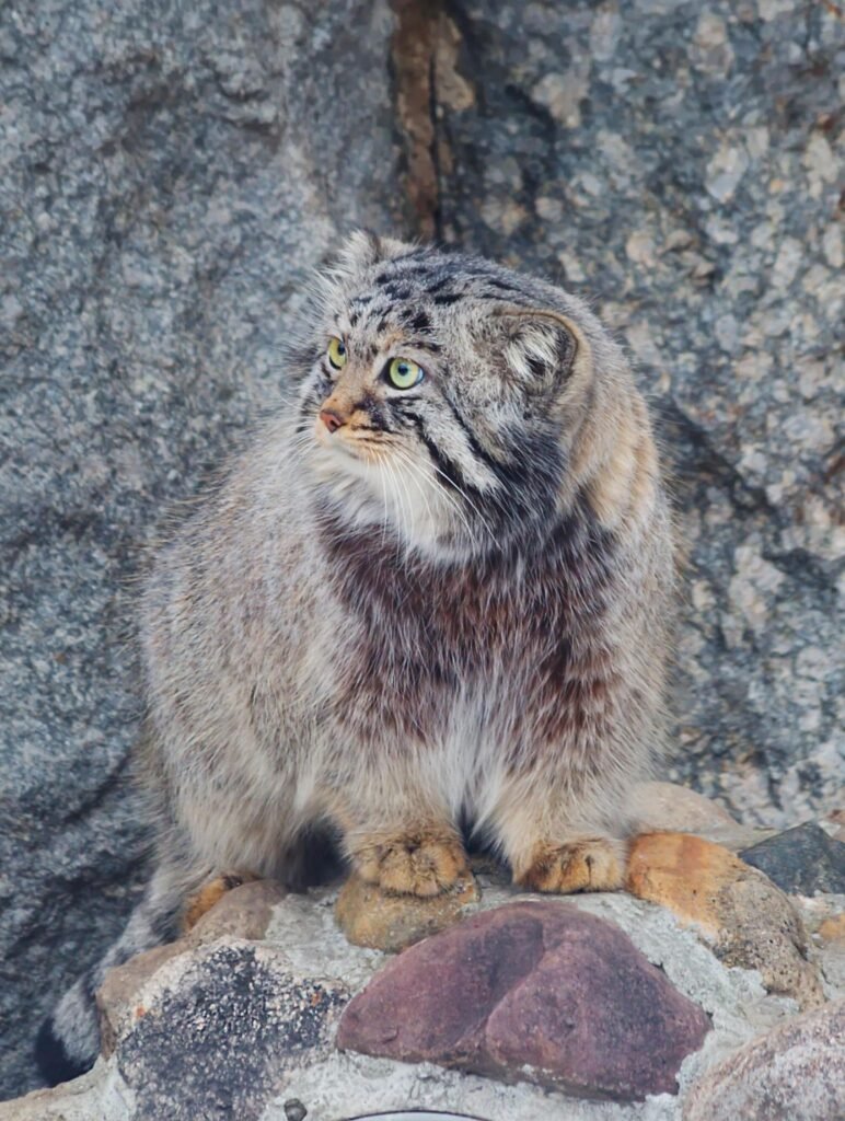 The Pallas’s cat, Otocolobus manul, also known as the manul, is a small wild cat characterized by its stocky build, long, dense fur that makes it appear larger than it is, and a distinctive flattened face with wide-set, low-set ears and round pupils. Native to the harsh, cold steppes and mountains of Central Asia, its coat color ranges from grey to reddish-brown, often with subtle stripes, providing excellent camouflage in its rocky, arid habitats. This solitary and largely crepuscular (active at dawn and dusk) hunter is highly adapted to its extreme environment, with thick fur for insulation and a relatively flat head that helps it peek over terrain while hunting. Pallas’s cats primarily prey on pikas, voles, and other small rodents, along with birds and insects, often ambushing them near burrows.